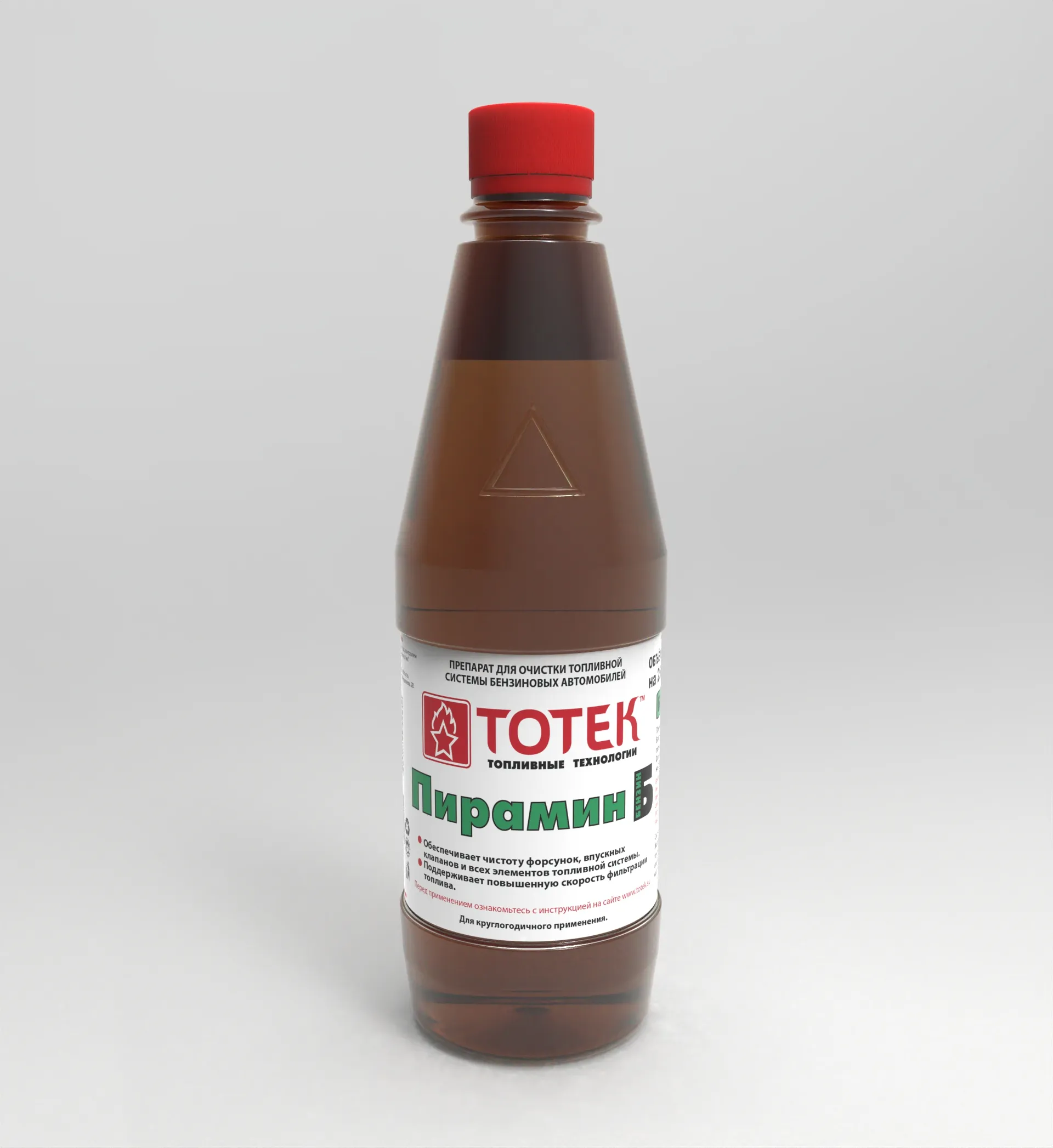 «ТОТЕК Пирамин — Б» упакован в флаконы из ПЭТ материала объёмом 0,5л. и 0,1л по 20штук в коробке из картона, предназначен для введения в бензины Аи-80, Аи-92, Аи-95, Аи-98 в пропорции 1 флакон на 250л и 50л топлива соответственно, для активной очистки топливной системы концентрацию препарата можно увеличить. Применять профилактически рекомендуется один раз за период пробега автомобиля 20,0-30,0 тыс.км. На загрязнённых топливных системах автомобилей рекомендуется отжечь не менее 3-4 полных бензобаков топлива с добавлением моющего препарата ТОТЕК Пирамин — Б.